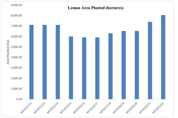 The lemon production area is in the northern and central part of the country, from the Coquimbo region to the O’Higgins region. Lemon area planted grew in all of Chile’s producing regions during the past