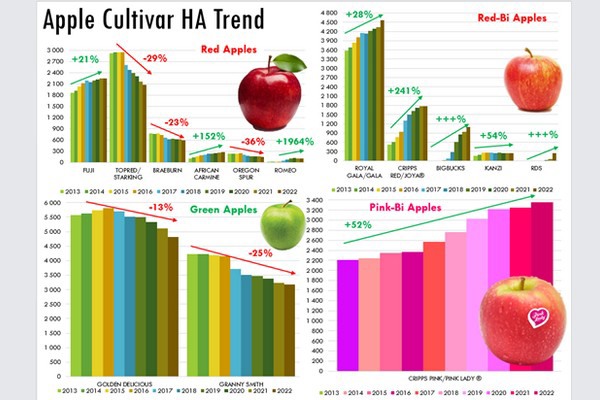 Red-Bi apples, with varieties like Royal Gala and Kanzi, have been seeing an this upward trend in the same period. Red apple varieties have been up and down, with Fujis and African Carmines increasing, but Braeburns and Oregon Spurs going down.