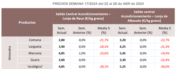 The prices corresponding to week 17 of 2024 shared by MAPA, based on data from the markets of Reus and Albacete, reveal that all varieties have, in fact, recorded price drops. In most cases, these exceed 20% compared to the average of the last 5 years. For organic almonds, prices have dropped by up to 30%.