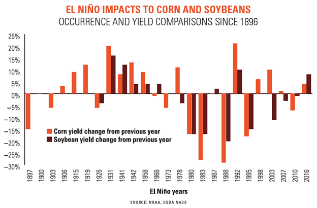 There have been 25 growing seasons since 1896 in which NOAA has recorded El Niño activity. In 15 of those events, corn yields increased an average of 9% from the previous year. In the remaining 10 years of yield decreases, annual yields dropped by an average of 13%.